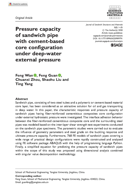 3月8日,我院2018级博士研究生万锋同学在Sage旗下期刊Journal of sandwich structures & materials在线发表题为"Pressure capacity of sandwich pipe with cement-based core configuration under deep-water external pressure"的论文(http://dx.),万锋同学为第一作者,其导师管锋教授为通讯作者,长江大学为第一署名单位。