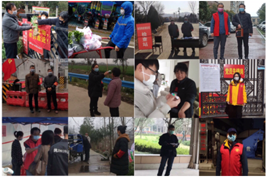 和以上党员一样,我院有不少的党员同志主动请缨参与了社区抗疫:参与南苑小区防疫值班的侯作富同志;参与东苑小区值守和物资配送的唐明、邓福成同志;在天门卡点防疫值守的龚敏同志;在油苑小区参与防疫工作的李翔、冉小丰同志;在江陵县郝穴镇双桥村,参与出入登记、体温测量、物资分发及突发事件处理的竺正海同志;在观音垱镇参与值守的眭满仓同志;在沙市滨湖小区发放物资的易先中同志;在广东一小区参与防疫值守的刘旭辉同志;在楚都御苑小区参与防疫工作的马卫国、李美求、陈义厚同志;在沙市惠工社区参与防疫值守的王喆同志;在利川社区监控居民健康状况的向如同志;在潜江社区参与防疫值守的田华同志;在山西昔阳一社区参与值守的张云华同志;在仙桃德政园社区值班的李哲同志;在沙市洪垸小区值班的吴修德同志;在胸科医院小区值班的黄万钢同志等等……,他们以实际行动在完成本职工作之余为防控疫情努力着。