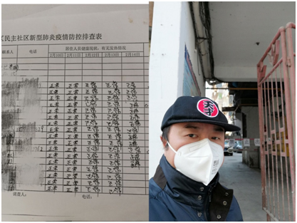 王新宇同志是我院最早下沉社区的党员之一。“2月9日,我在 ‘学习强国’平台上看到习近平总书记号召党员干部下沉社区的信息后,就想着要为社区做点事”,后来他及时到所居住的陶家巷社区报道,按照小区的安排,参与防疫工作。他每天值守四个多小时,挨个电话询问48户居民家庭的健康状况,为小区居民发放捐赠物资……小区居民多,疫情防控登记记录信息工作量大,他每天耐心地询问每户信息,仔细记录体温状况,不落一人。看似平凡的岗位,为社区防控疫情提供了第一手资料。“防护物资紧缺,第一天社区给发了一个N95口罩,我觉得很珍贵,戴了三天。”尽管所服务区域条件艰苦,没有大门,没有坐的地方,没有充足的防护物资,风里雨里,王新宇同志毅然每天坚守在社区防疫第一线,这份坚守的背后,是作为一名共产党员的不畏困难,勇于担当!