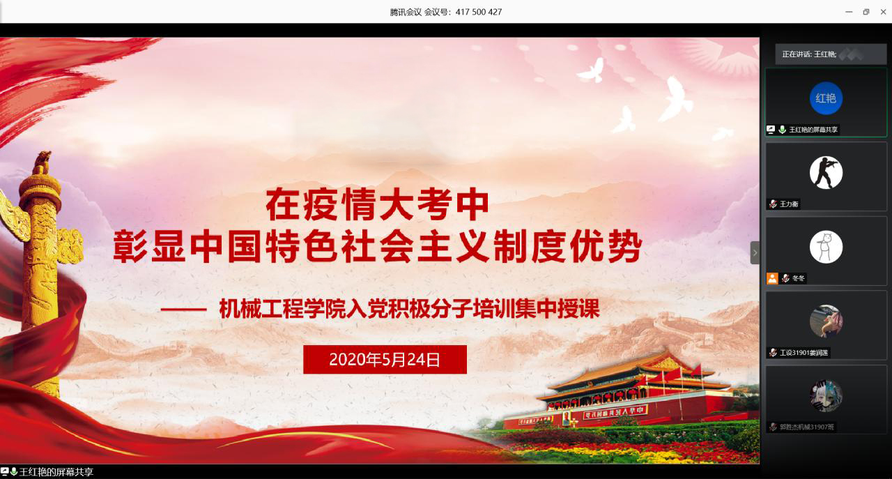 5月24日晚7时,beplay全方位手机移动平台开展入党积极分子培训集中授课,88名入党积极分子参加培训,此次培训由学院分党委书记王红艳讲授,主题为《在疫情大考中彰显中国特色社会主义制度优势》,学生党支部书记、辅导员刘冬冬老师主持并全程参与学习。