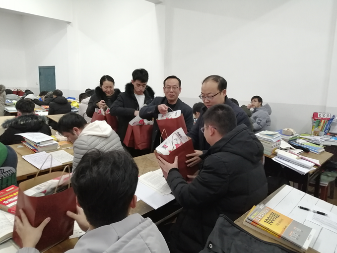 网红的小麻花、青春版的花生、美味的桃酥、甘甜的豆奶、祝福的卡片……学院挑选的礼物挤满一个个红色福袋,整齐地码放在前台桌子上,饱含温暖又寓意美好:此战必定开花结果。在院长管锋的带领下,学院党委副书记竺正海、学工办主任杨琴、辅导员关明一同为考研学子送上福袋。