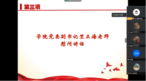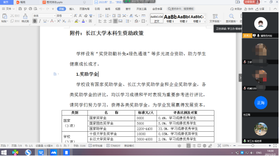两位同学首先为老师们介绍了自己的寒假近况以及入学以来的学习生活情况,同时向学院领导老师们的慰问表示了感谢。资助专干杨琴老师为同学们详细介绍了我校的本科生资助政策,从奖助学金申请、勤工助学岗位、如何申请补偿或选择有补偿性的就业方式等方面进行了全方位的解读,同时勉励同学们在大学期间重视英语四级,勤奋学习,德智体美劳全面发展。