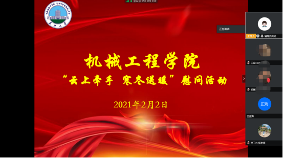 献一份爱心,温暖冰冷寒冬,送一句问候,心中阳光和煦。2021年2月2日下午14点,beplay全方位手机移动平台开展了“云上牵手 寒假送暖”慰问活动,参加此次活动的有:学院党委副书记竺正海老师、资助专干杨琴老师以及2020级的两位同学,辅导员向如主持活动。