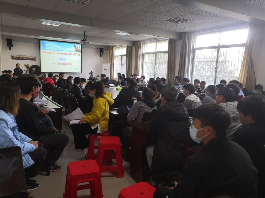 报告一由我院邓福成副教授对深水油气开采中的储层出砂问题进行汇报,他从出砂的工程解释、出砂的危害以及防沙的措施等方面进行了介绍。同时结合目前深水油气开发所面临的出砂问题,分析了出砂的原理,并对所分析的出砂原理进行试验验证和数值模拟验证。
