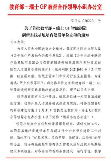接下来我校将围绕项目建设任务,立足区域装备制造业产业集群需求,引入瑞士GF及产业链相关企业资源,统筹规划,根据智能制造技术发展趋势和国家产业结构调整方向深化专业人才培养模式改革,切实开展应用型人才培养模式的探索与实践,创建一流的智能制造工程创新人才培养基地,把机械设计制造及其自动化、机器人工程等专业建设成为服务智能制造产业升级、行业内高度认可的一流专业,打造长江大学新名片。