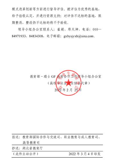 我院作为全国首批入选50家建设单位之一参加了于3月31日举办的项目建设启动会。启动会采用线上直播形式,教育部国际合作与交流司副司长方军、高校毕业生就业协会会长王路江、瑞士驻华大使馆经济参赞Yves Reymond、乔治费歇尔集团GF加工方案中国总裁陈以祥等领导和专家出席现场启动仪式,与所有培育建设单位代表共同启动基地建设项目。会上还发布了基地建设指南(暂行),研究探讨了校企共建的重点任务,对下一步工作做了部署。