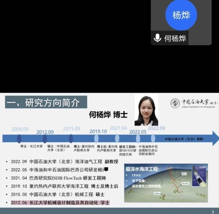 何杨烨副教授结合自己在博士、博士后期间的研究工作,分享了海洋立管的设计分析方法。她介绍了当前海洋立管在工作过程中所面临的问题,并详细讲述了涡激振动、段塞留等环境下下海洋立管设计中的解决方法和思路,结合当前深海立管的需求及研究进展,何博士向同学们介绍了团队在该领域即将开展的主要研究工作,期待有更多的老师及同学能够加入,为我国深海装备的研发贡献力量。