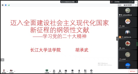 为深入学习宣传贯彻党的二十大精神,确保党的二十大精神落地生根、开花结果,根据院党委部署安排,12月28日,我院通过线上方式举行了学习宣传贯彻党的二十大精神宣讲会,法学院胡承武副教授受邀作专题报告,活动由学院党委书记王红艳主持。