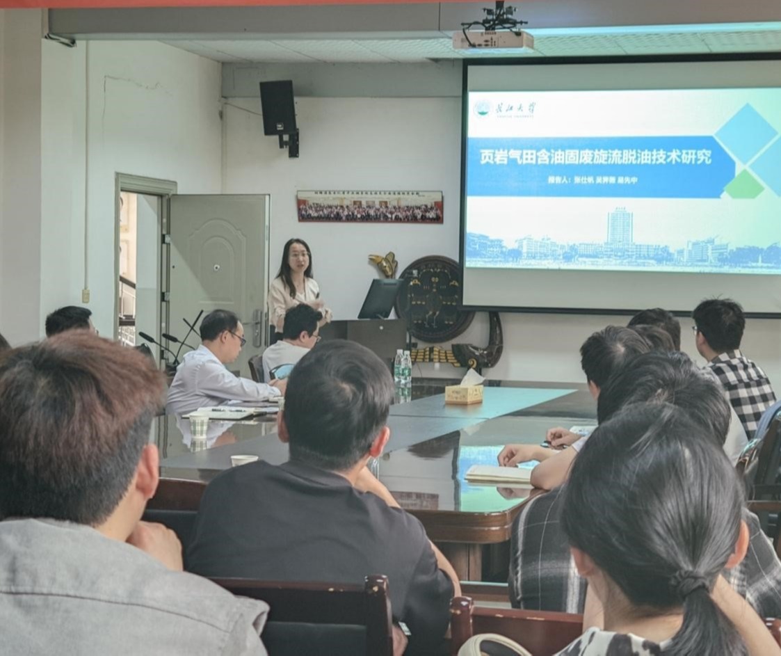 吴霁薇博士结合自己的研究,针对页岩气田含油固废旋流脱油技术成果进行展示。详细讲述了降低旋流拖油后固废含油率的设备及工作机理。然后就“可燃冰”海底旋流自转破胶除砂器展开介绍。并通过试验证明该设备可以有效的将处理后的岩屑中含油率降低到1%,满足国家环境排放要求,减低其对环境污染。