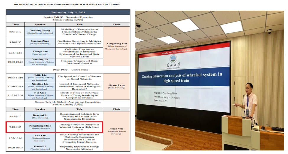 缪博士作了题为《Grazing bifurcation analysis of wheelset system in high-speed train》的报告,该报告详细介绍了高速列车轮对系统非光滑动力学的背景、研究现状及发展展望。报告部分成果得到了缪博士主持的国家自然科学基金项目的资助。