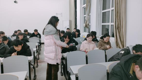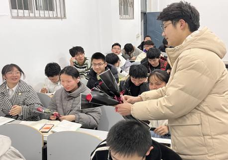 “节日快乐!”“青春永驻,快乐常在。”“女神节快乐,事事如意,天天开心。”在西校区,3月7日晚自习时间,院团委书记吴钐老师带领学生会成员进入教室,将精心包装好的鲜花亲手递给每一个女生,并附祝福。女生们收到鲜花后,都纷纷感叹:“这花真美!”“咱们院真的太让人感动了!导员真的好用心!”“感谢女生节独有的浪漫!”