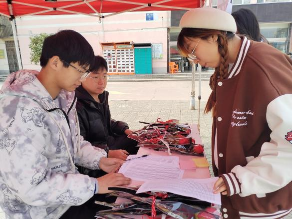 在东校区活动现场,我院女生可持身份证明领取一朵学院精心准备的玫瑰,并在活动展板上留下一句祝福,增强各位女生的节日参与感与幸福感。