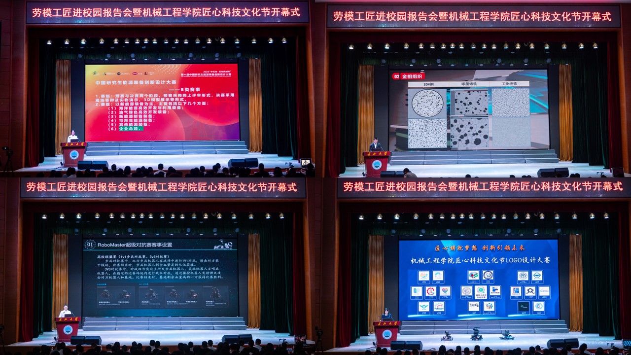 活动第二部分:机械学子2023年创新实践成果汇报。荣获中国研究生能源装备创新设计大赛国赛一等奖、全国大学生金相技能大赛一等奖、RoboMaster超级对抗赛全国二等奖的获奖团队代表依次上台分享他们的创新实践故事并向现场同学们发出新一轮的参赛邀请。