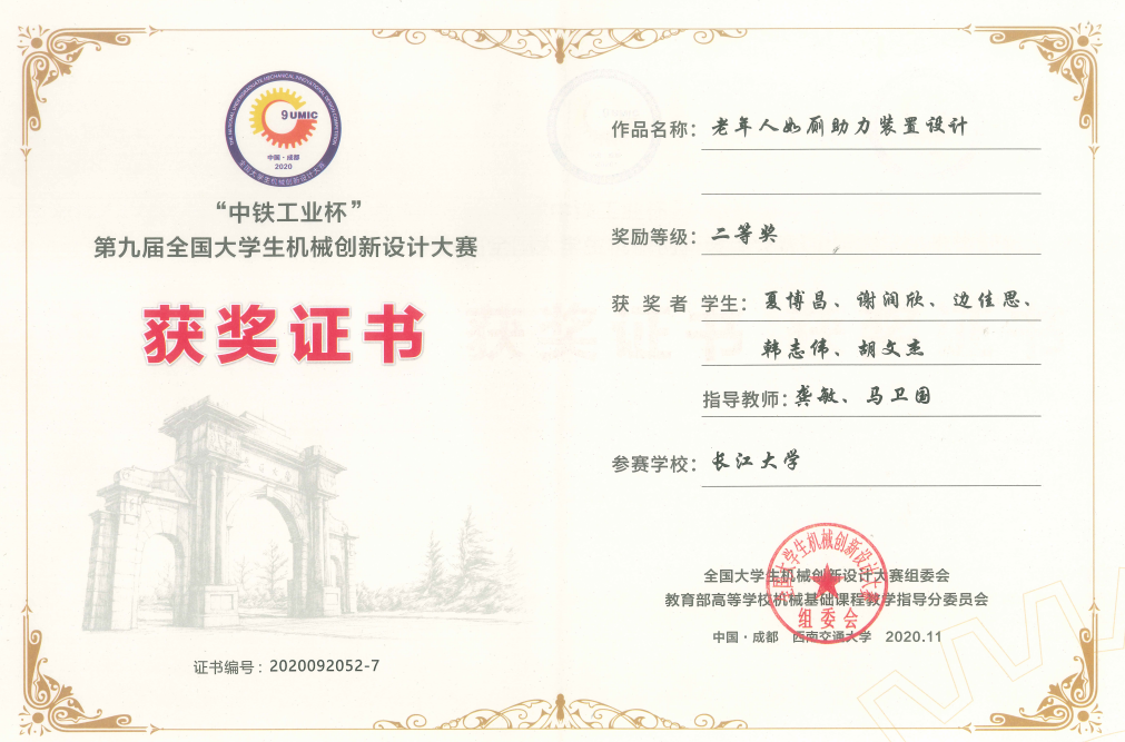全国大学生机械设计创新大赛二等奖: