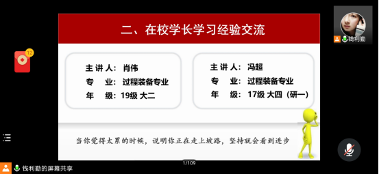 (通讯员王玉璐)2021年1月23日晚7时,我院过程装备与控制工程系召开2020级新生交流会线上会议。本次会议的嘉宾有:装备系主任张慢来,在校优秀学生肖伟、冯超,毕业校友代表雷磊、袁龙,哈佛交流学习博士吴霁薇。装备系教师、辅导员向如及全体2020级机械类学生参会,装备系钱利勤老师主持会议。