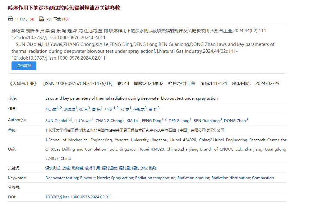 2月25日,中国科技期刊卓越计划行动计划期刊、石油天然气工业领域/地球科学领域高质量期刊T1级《天然气工业》(中国“百强报刊”、EI收录,复合影响因子5.915、综合影响因子5.201)刊发了我院孙巧雷副教授、冯定教授团队关于深水测试作业安全的最新研究成果 “喷淋作用下的深水测试放喷热辐射预测与预防”。我院孙巧雷副教授为论文第一作者,冯定教授为论文的通讯作者,长江大学beplay全方位手机移动平台为论文第一完成单位。