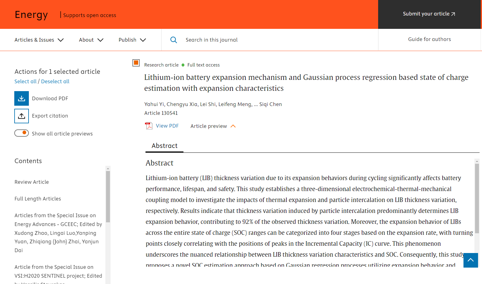 2024年1月31日,中科院一区top期刊《Energy》(《能源》,IF: 9.0)在线刊发了关于锂离子电池膨胀机理的最新研究成果。论文题目为:“Lithium-ion battery expansion mechanism and Gaussian process regression based state of charge estimation with expansion characteristics(锂离子电池膨胀机理和基于高斯过程回归的电荷估计状态)”。我院硕士研究生生伊亚辉、夏成宇教授为论文共同第一作者,钱利勤副教授为论文的通讯作者,长江大学为论文第一完成单位。