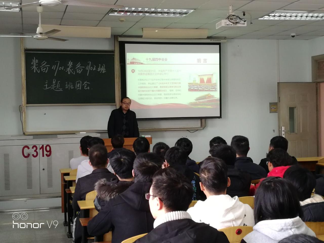 12月10日下午,院长管锋在13教C319专题宣讲党的十九届四中全会精神,班主任代荣荣老师及联系班级装备11701班、装备11702班全体同学参加。