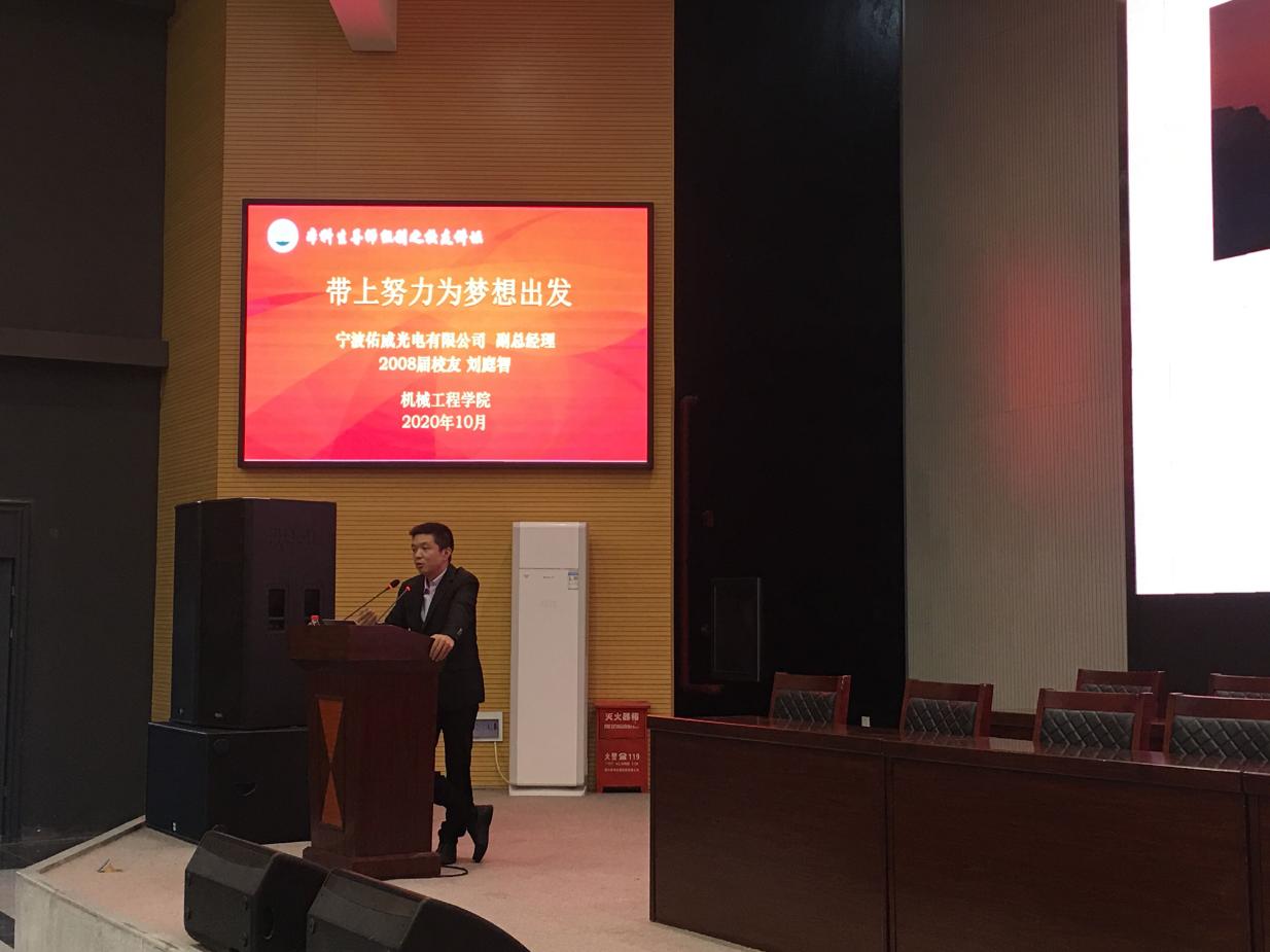刘庭智2008年毕业于机械学院机电10501班,现为宁波佑威光电有限公司副总经理,同时创办并参与多家企业管理。此次回校以《带上努力,向梦想出发》为题,为学弟学妹分享自己追梦之旅。