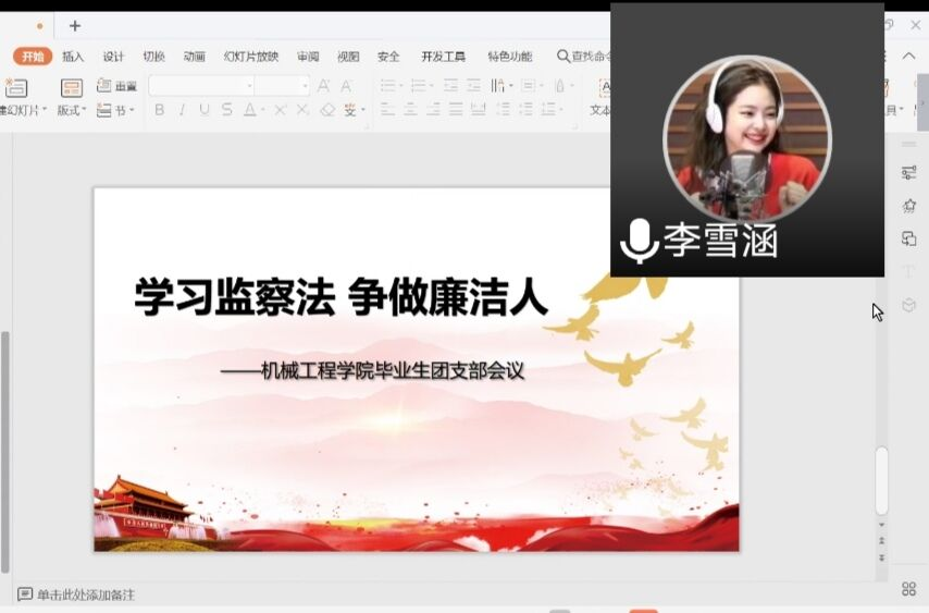 如何在2020届毕业生落实"学习监察法,争做廉洁人"主题活动?团会上,团委副书记李雪涵对"学习监察法,争做廉洁人"活动进行详细布置,要求各班学习围绕制定监察法的重要意义、监察法草案起草过程指导思想和基本思路及监察法草案的主要内容等方面进行学习。会后,各班团支书组织本班同学线上学习,并将学习效果报学院备案。向如老师强调此项活动非常重要,他要求大家尽快落实各团支部的学习监察法活动,确保本次学习的参与率和学习效果。