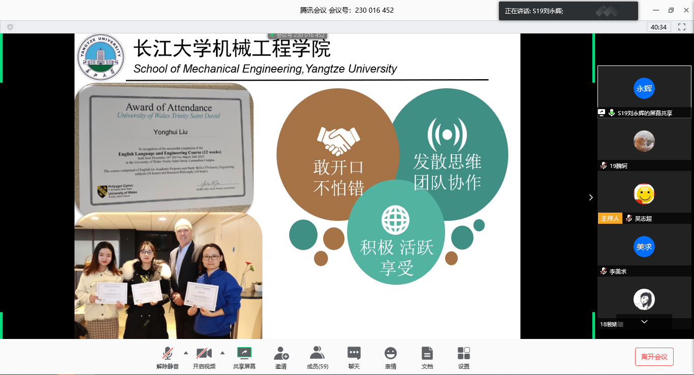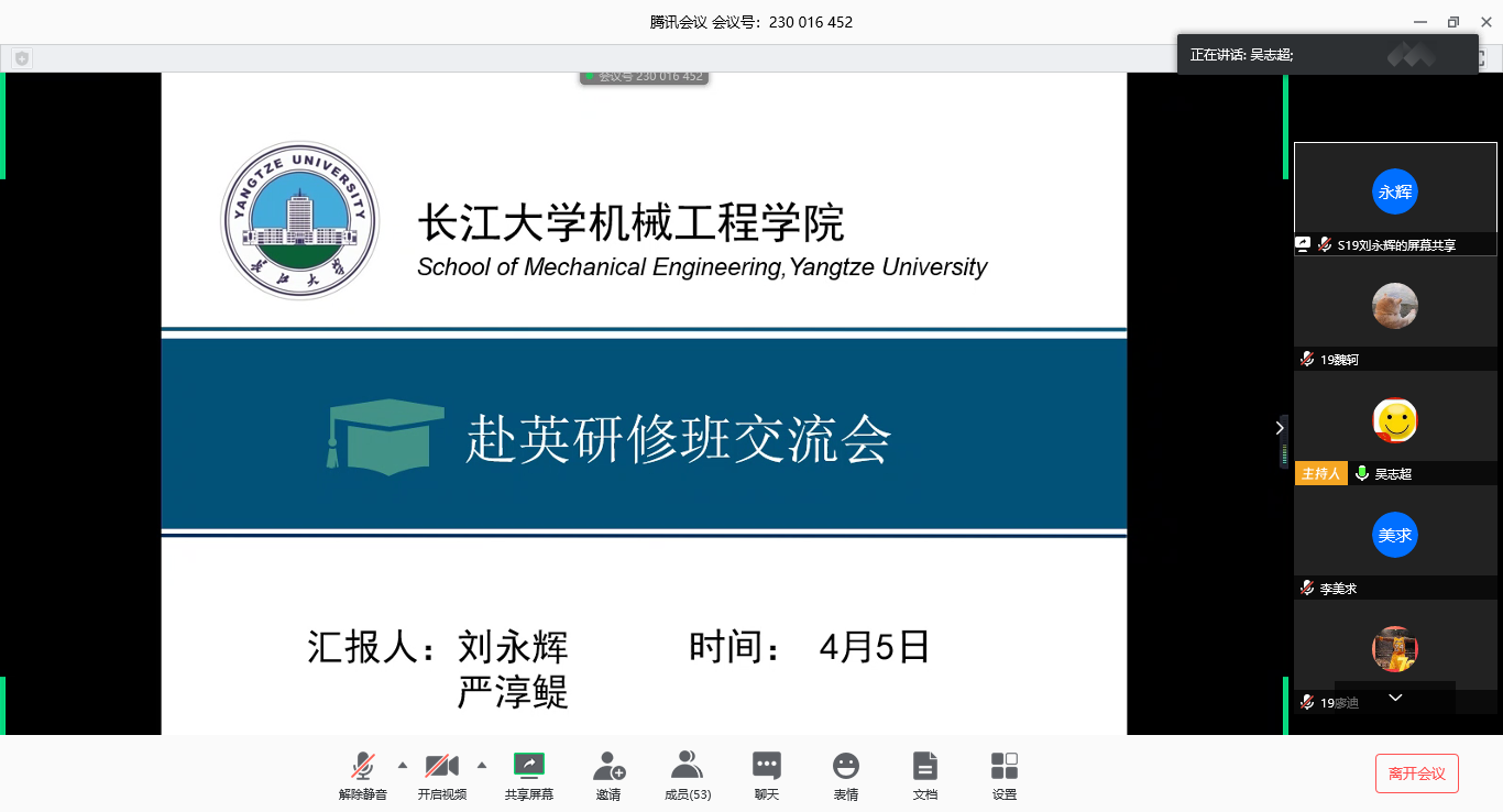 4月5日下午,beplay全方位手机移动平台举行赴英研修班学子线上交流汇报会,硕士研究生刘永辉和严淳鳀与机械研二、研三学生分享英国三个月学习体会,交流探讨促成长。副院长李美求出席会议,活动由研究生学生会主席吴志超主持。
