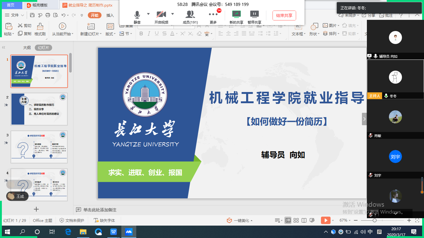 3月17日,beplay全方位手机移动平台利用腾讯会议为200多名毕业生开展就业“云讲座”,提升学生简历制作能力和面试技巧,辅导员向如、刘冬冬组织此次活动。
