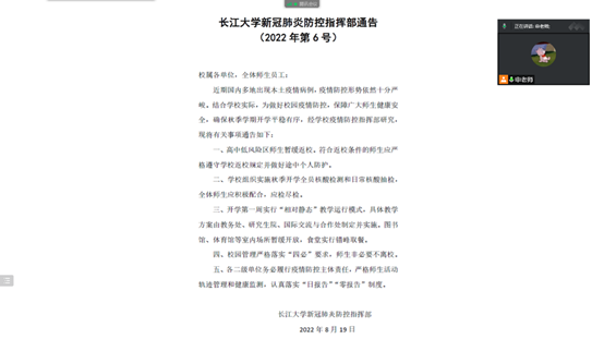 会议内容主要包括三个方面:开学安排、报到须知与安全提醒。首先,每位辅导员详细讲解了开学安排,并带领同学们一起学习了《长江大学新冠肺炎疫情防控指挥部通告》(2022年第6号 )、国家卫健委《新型冠状病毒肺炎疫情防控方案(第九版)》、教育部《高等学校新冠肺炎疫情防控技术方案(第五版)》等相关重要文件精神。其次,辅导员为同学们介绍了如何使用今日校园APP进行线上返校申请的操作流程。最后,每位老师提醒同学们在返校途中做好旅途防护,并耐心逐一解答了大家提出的每一个问题,消除了同学们心中的顾虑,使每位同学可以安心顺畅地返校报道。