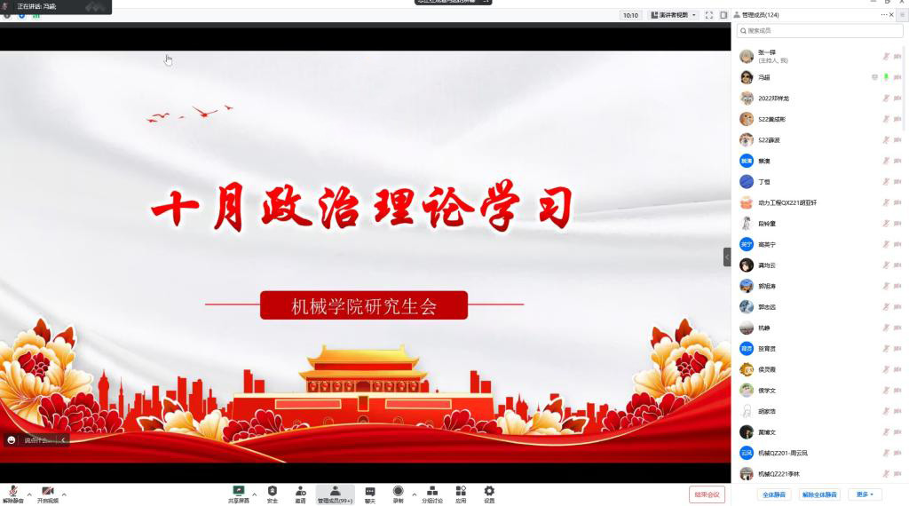 为深入学习宣传党的二十大精神,切实加强研究生思想政治教育,机械学院于10月19日开展研究生政治理论学习,会议由王婧宇主持,全体研究生参加。