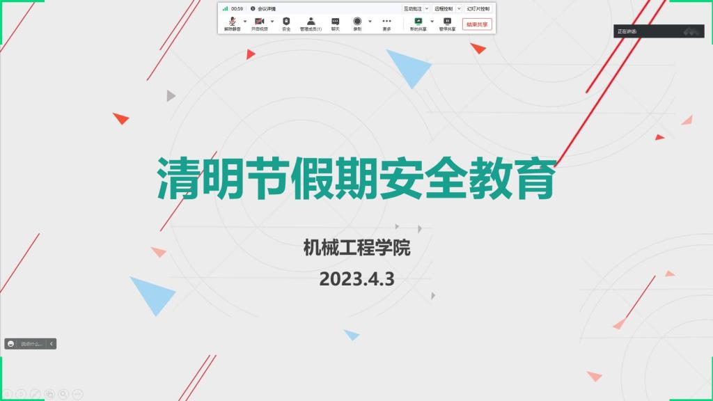 (通讯员 郝金梦)4月3日晚上,机械学院召开清明节假期安全教育工作会,宣讲安全教育事项,布置班级安全教育计划,全体安全员参加线上会议。