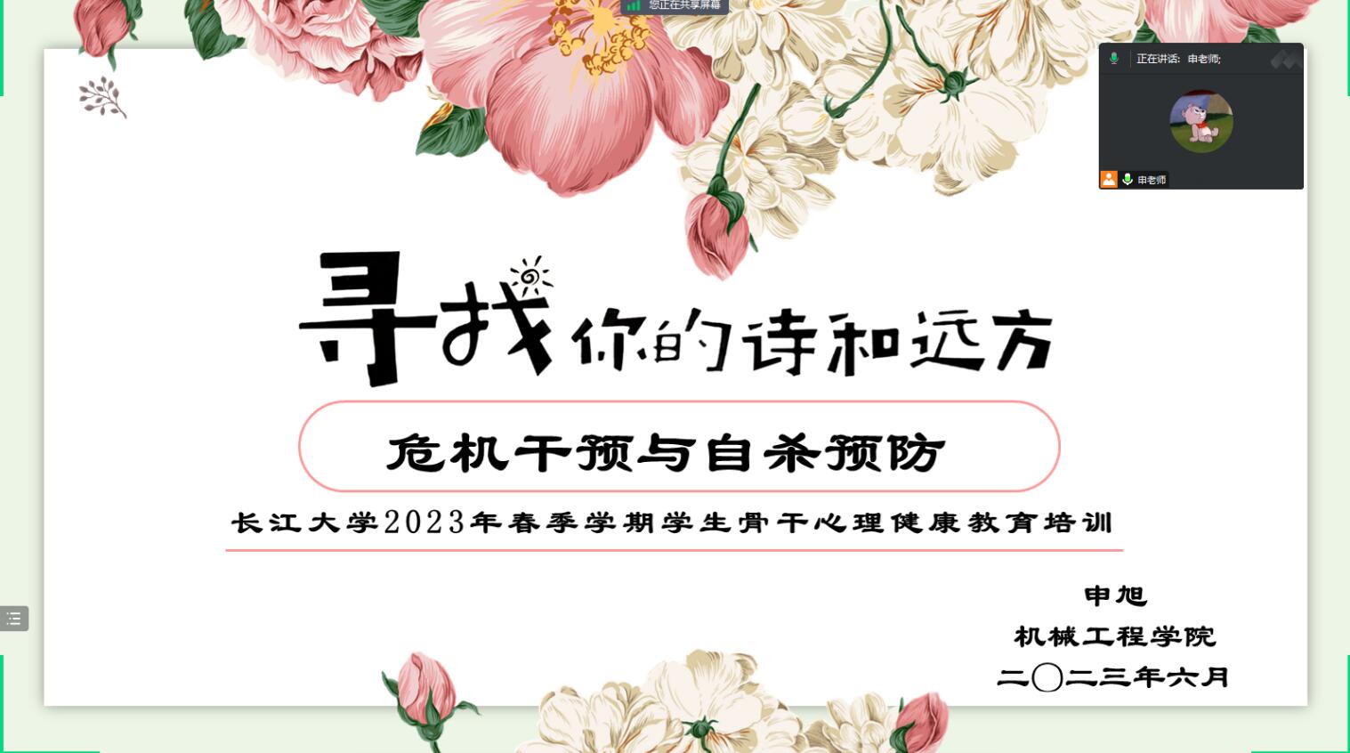 此次培训以“危机干预与自杀预防”为主题,心理专干申旭老师带领同学们理解探寻生命意义的积极意义,了解心理危机的含义和特点,并结合大学生常见的心理危机类型,强调识别与干预心理危机的重要性,引导学生骨干建立起对于自杀危险信号的警觉性,加强对身边同学关注和关心的能力。培训最后,申旭老师详细介绍了我校心理健康教育中心的地点、功能及24小时生命热线,鼓励有需要的同学积极寻求专业的帮助。