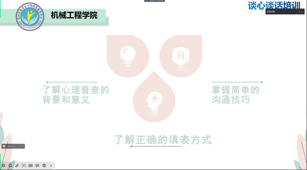 “ 18~24岁年龄组是心理问题高发的群体,大学时期的学生性格快速发展,是极易出现心理健康问题的一个阶段。”从背景引入,结合学院普查的实际工作情况,苏老师针对学生心理健康访谈工作进行详细的讲解。首先,能够区分学生的心理状态。其次,对学生的心理问题的预防和发现也提出了建议。再者以案例辅助,分享了与学生交谈中的经验与技巧。在集中学习《心理测评量表讲解》和《谈心谈话培训》两个视频文件后,老师们纷纷表示收益良多。